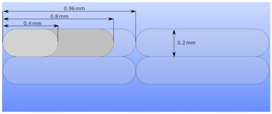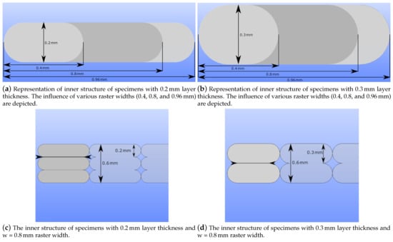 In Figure 3c,d, we demonstrate the difference between the contact areas of two layers. Changes in layer thickness result in different inner structures and mechanical properties, specifically when different slicer software is employed. Slicers have significant effects on flow characteristics [], which influence the shapes of deposited fibers in FDM. In this study, we used an Ultimaker Cura slicer. Deposited fibers become more elliptical with decreasing layer thickness, which leads to relatively higher contacts between adjacent layers and stronger bonding (see Figure 3d). This situation also results in lower porosity on the macroscale. Change in layer thickness and raster width parameters are depicted together in Figure 4 for a better illustration.