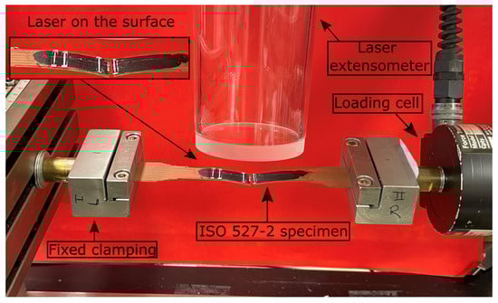 A clamped ISO 527-2 specimen into a MTS Tytron 250 testing equipment with a laser extensometer (top), a loading cell (right), and a fixed mounting side (left). Displacement is applied horizontally through the right mounting side. Laser is visible on the surface of the specimen (top–left).