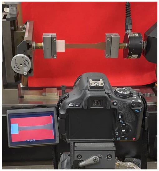 Nearly frictionless displacement is achieved due to hydraulic air-film-bearing system. A laser extensometer is conducted for measuring strain (Figure 6). Furthermore, deformations on the surfaces are observed (see Figure 7). Canon EOS 600D camera ( pixels, 1 picture/2 s) is used, and the displacements on the deformed surfaces from recorded pictures are visualized. Engineering stress and strain were computed from experimental force and displacement measurements. Postprocessing was carried out by the device-own software for calculating ultimate tensile strength (UTS) and Young’s modulus. Five samples from each group (see Table 3) were tested for reliable results.