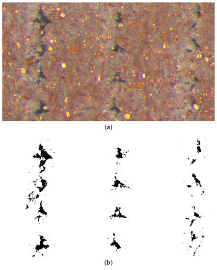 Binarized micrographs with two different modes ((a) representation of particles and (b) microporous areas) for the specimens with 0.2 mm layer thickness and 0.8 mm raster width configuration. The original microscope image of this configuration can be found in Figure 15e.