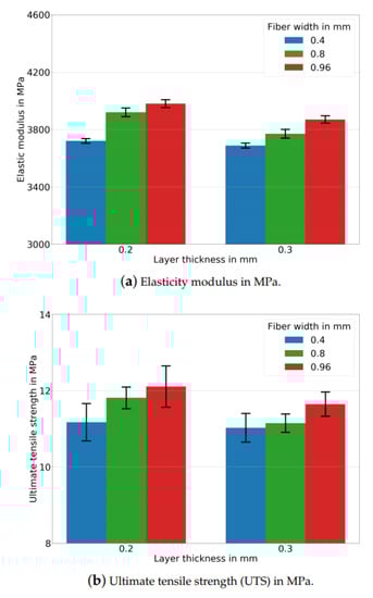We emphasized that both a lower layer thickness and a larger raster width increased the elasticity modulus analogously. However, these parameters altered the inner structures differently (see Figure 3). As a result, if a higher stiffness is intended, the layer thickness is to be lowered, and the raster width needs to be increased. We also stress that all these changes in the process parameters depend on the flow characteristics of the printed materials, slicer/printer types, and environmental conditions. Higher UTS results are measured with a lower layer thickness and larger raster widths. We provide Table 5 for the experimental UTS results. The reason is related to the aforementioned stronger bond formation between the adjacent layers and fibers due to greater contacts and lower porosities.