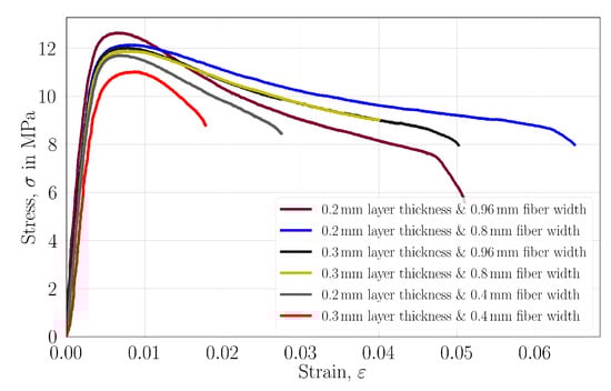 The stress–strain curves are provided in Figure 12 for each experimental configuration. Generally, longer softening behavior is observed in the specimens with lower porosities. They reached an ultimate tensile strength in the higher strains and have a mostly higher strain at the failures. Here, the energy release is meant to be the area under the curves. We interpret that altering the inner structure is important to increase the mechanical properties; however, strong bond formations between fibers and layers are needed for long softening behavior as it also mostly happened in the specimens with lower porosities. FDM-printed polymers generally show lower mechanical properties than mold specimens when they have weak bonding between adjacent layers and fibers []. This situation is proven here, as the specimens with higher porosities exhibit lower mechanical properties and energy release.