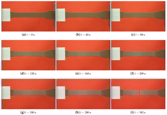 We observed the deformation behavior of some specimens during the tensile testing with a high-resolution camera. The camera record of a specimen is provided in Figure 13. The test took 5 min and 45 s. We divided the camera record into every 40 s in order to show the elongation and the failure. The deformation became visible after s, by the white color on the specimen (see Figure 13d). A small microcrack is nearly visible in s (see Figure 13h, in the center of the specimen). This propagated in the following seconds up to s and led to specimen failure in s. (Figure 13i). A brittle failure is observed. We stress that there was a homogeneous stress distribution and hence deformations between the shoulders of the specimens, which was understood by the homogeneous distribution of the white colors in Figure 13. An adequate failure position was seen as the rupture occurred in the center of the specimen. This is a proof of optimum FDM printing and testing conditions. For more information, we refer to []. Moreover, another camera record during the tensile testing is provided in Figure 14, as the microcrack initiation and propagation stages are relatively more apparent.