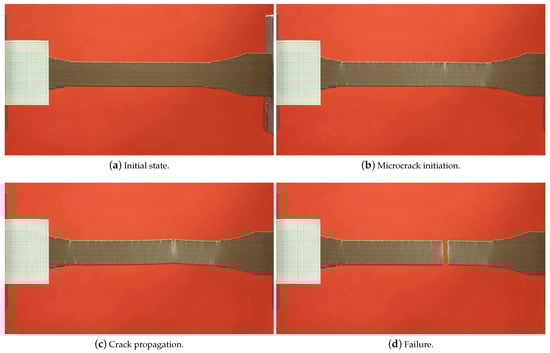 Different stages of the failure. The initiation of microcrack and its propagation occurred in 2 s. After Figure 13c, the specimen failed immediately.
