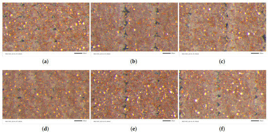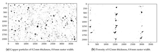 In the 0.8 mm and analogously in the 0.96 mm raster width configurations (see Figure 15b–f), there are relatively larger contact lines between the fibers. Therefore, we assume that the higher molecular diffusion occurred, especially at 0.96 mm. As seen in Table 6, the porosity decreased to 1% by optimizing the parameters. Additionally, we interpret that enough molecular diffusion leads to interlayers as good as the fiber itself in 0.96 mm, because we do not observe any significant color difference between the aforementioned areas in Figure 15c–f. We provide Figure 16 for representing the binarization of the copper particles and microporous areas, separately, using the digital image analysis with machine learning.