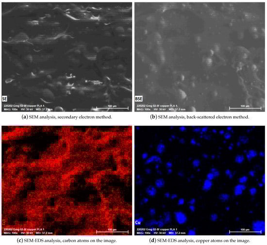 We provide SEM images and depict the EDS analysis results in Figure 18. Two different imaging modes are utilized as the secondary electron (SE) (see Figure 18a) and back-scattered electron (BSE) methods (see Figure 18b). Back-scattered electrons are reflected back from the samples, and most electrons do not lose their energy on the specimen surface. Therefore, it is assumed that BSEs make elastic interactions with specimens. Secondary electrons originate from the surface of FDM-printed copper-reinforced PLA specimens. Hence, it is interpreted that SEs are derived by inelastic interactions.