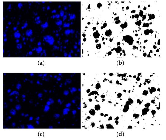 After microscopy, a digital image correlation (DIC) code was developed and used for calculating porosity from 2D images. DIC code was written in Python language with Tensor-flow packages []. The code first imports the microscope images using Opencv (cv2) [], and they are transformed into 2D NumPy arrays []. Then, they are binarized by applying color range thresholds to the NumPy arrays, and all colors in images are reduced to black and white. Binarization helps to calculate porosity effectively and prevents possible errors in further steps. After that, the code employs a machine learning algorithm, namely K-means cluster. This algorithm groups the data with similar characteristics. At last, the porosity is calculated by counting the pixels, which are collected from the K-means cluster. For more information about DIC code development, binarization, and employment of machine learning algorithms in DIC code, we refer to [].