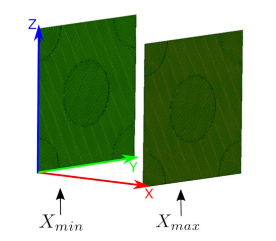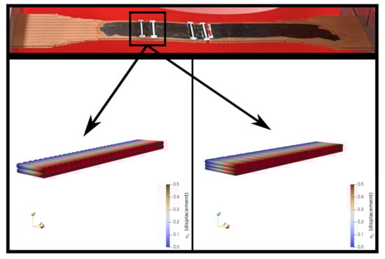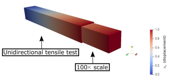 - We performed a uniaxial tensile test simulation on a simple bar with the multiscale homogenized stiffness matrix as an input parameter. In this way, we checked and validated the proposed homogenization system. By comparing the simulation, its 100× scale (see Figure 25), and the laboratory experiments (see Figure 13), we observed that similar elongation and contraction profiles of the manufactured specimens occurred in the simulations (elongation in the x axis and transverse contractions along the y and z axes, Figure 25).