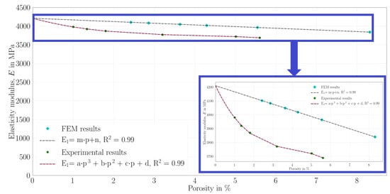 After that, the elasticity modulus is computed by using the fit functions Equation (11) and Equation (10) for 1–6% porosity ratios. In this way, the elasticity modulus for the same porosities is compared in Table 11.
