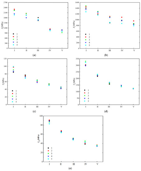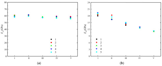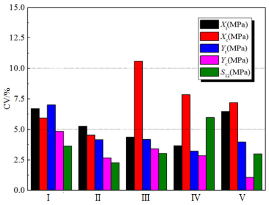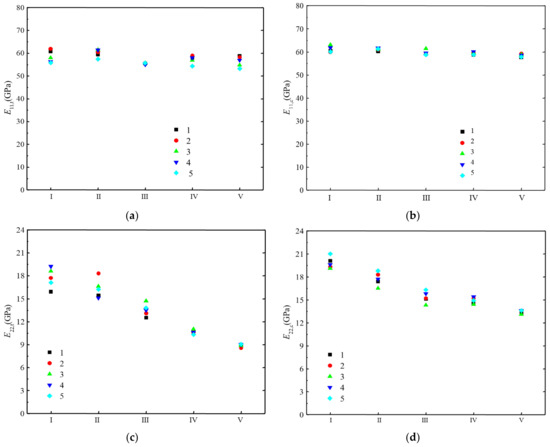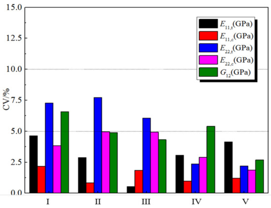 Table 4 gives the average value, standard deviation, and coefficient of variation of the stiffness properties of the five batches of H-GFRPs under the different conditions. The results show that under conditions IV and V, the stiffness properties controlled by the fibre, such as E11,t and E11,c, basically do not change while the properties controlled by the matrix, such as E22,t, E22,c and G12, decrease greatly.