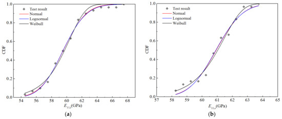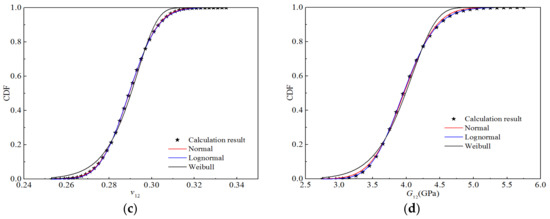 Figure 10 exhibits the cumulative distribution probabilities for the five stiffness properties in addition to the fitting curves of the three distributions under a humid and hot environment. It can be seen that the fitting curves for the normal and lognormal distributions almost coincide, whereas that for the Weibull distribution is clearly different from the first two. However, in general, the fitting curves of these three distributions are in good agreement with the experimental data points.
