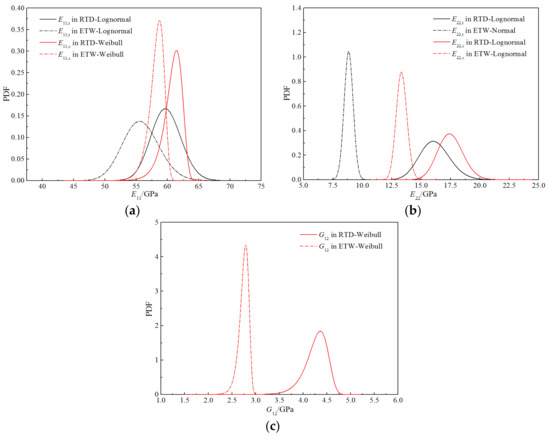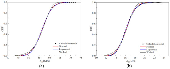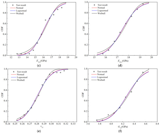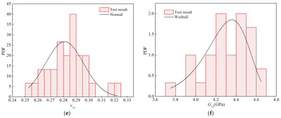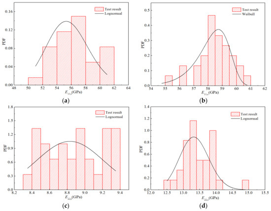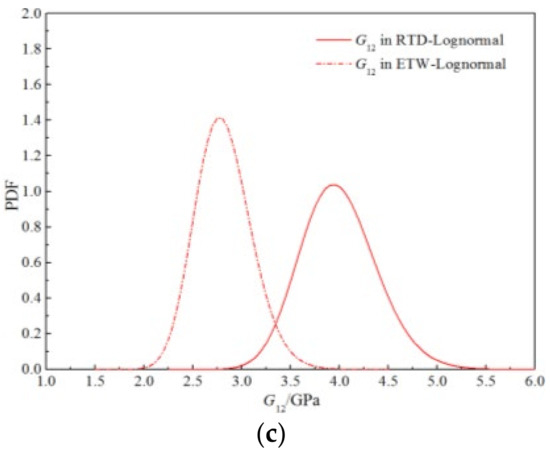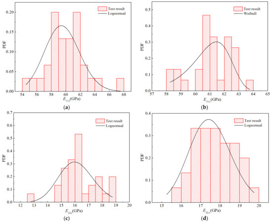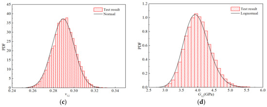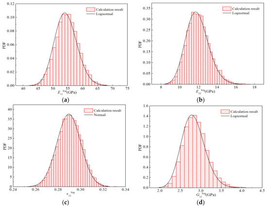 Table 15 shows the distribution parameters and goodness-of-fit values corresponding to the three distribution fitting curves. As can be seen, the longitudinal tensile–compression modulus E11 and Poisson’s ratio v12 tend to follow a normal distribution, whereas the transverse tensile–compression modulus E22 and longitudinal and transverse shear modulus G12 tend to follow a lognormal distribution. The goodness-of-fit of the best distribution was greater than 0.99998.