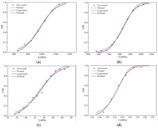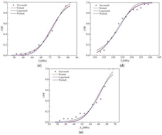 Figure 8 displays the cumulative distribution probabilities of the five strength properties, as well as the fitting curves of the three distributions under the RTD condition. It is apparent that the fitting curves of the normal and lognormal distributions almost coincide, and there are only slight differences between the upper and lower tails, whereas the Weibull distribution curve is significantly different from the first two. Nevertheless, it can be seen that the three fitting curves are in good agreement with the test data points.