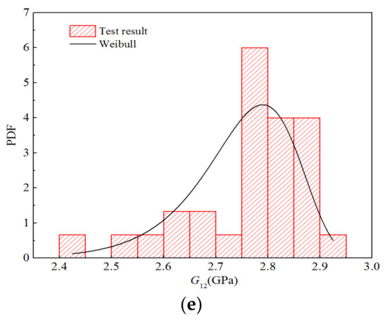 Probability function diagrams for the stiffness properties of H-GFRPs at RT. (a) E11,t, (b) E11,c, (c) E22,t, (d) E22,c, (e) v12, (f) G12.