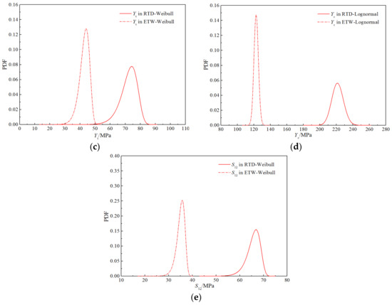 Probability distribution diagrams for the strength properties of H-GFRPs under the RTD condition. (a) Xt, (b) Xc, (c) Yt, (d) Yc, (e) S12.