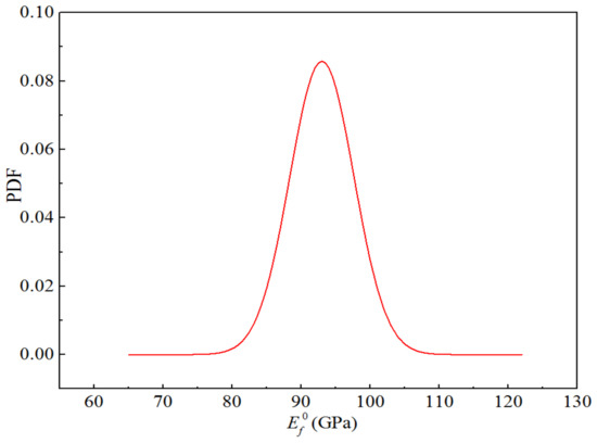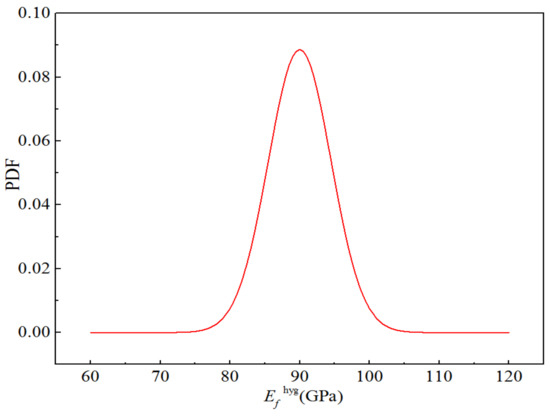 Table 17 lists the performance parameters of the component materials in a humid and hot environment. The glass fibre and epoxy resin matrix in H-GFRPs are isotropic materials, and their elastic and shear moduli are affected by humid and hot environment conditions. However, the influence of this environment on the corresponding Poisson’s ratio can be ignored. The elastic and shear moduli of the component materials listed in Table 17 can be calculated using Equation (6). In addition, the influence of humid and hot environment conditions on the fibre volume content was ignored. The CV of all random parameters was 0.05, and the distribution type was normal. The five random parameters were independent of each other. Figure 20 displays the probability density function for the elastic modulus of the glass fibre in the humid and hot environment.