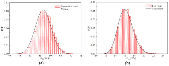 Furthermore, according to the frequency statistics listed above, the corresponding frequencies can be obtained to calculate the probability density distribution histogram for each elastic parameter, as displayed in Figure 18. The probability density function of the optimal distribution is also shown in the figure. It can be seen that the curves for the optimal distributions are in good agreement with the obtained histograms.