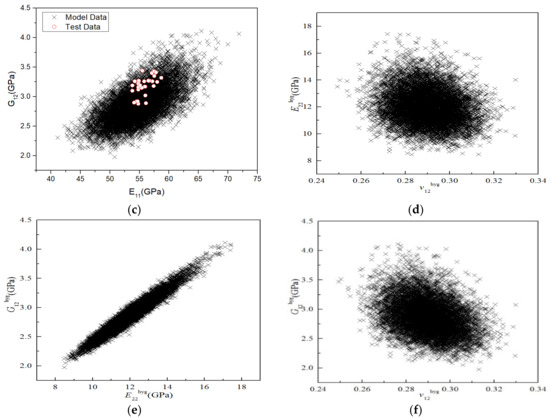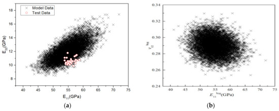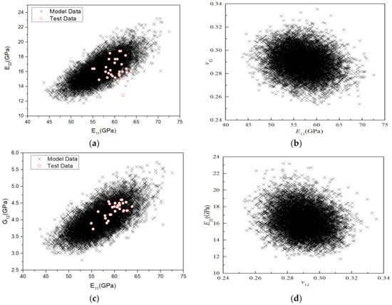 Furthermore, according to the micromechanical analysis, the correlation between various stiffness properties can be obtained. To qualitatively analyse the correlation between the stiffness properties, 10,000 sampling points were drawn in the coordinate system to obtain the correlation diagram between various stiffness properties, as shown in Figure 19. The closer the shape of the data point distribution is to a circle, the weaker the correlation; the closer it is to an ellipse and the higher the ratio of the long axis to the short axis of the ellipse, the stronger the correlation. As Figure 19 shows, the correlation between v12 and the other three stiffness parameters is weak, whereas that between the other three stiffness parameters is strong. Figure 19a,c show that the correlation numerical data between E11–E22 and E11–G12 completely covered the test results, indicating that the model can well predict the correlation of stiffness performance under RTD.