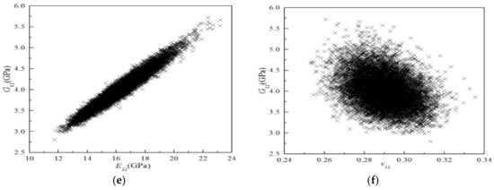 Here, x and y are random variables and N is the number of sample variables. The correlation between the parameters can be calculated from 10,000 sampling points of the material stiffness performance, as shown in Table 16. It can be seen from Table 16 that E11 is positively correlated with E22 and G12, with a correlation coefficient of approximately 0.7, and weakly correlated with v12 (−0.196); E22 is positively correlated with G12 with a correlation coefficient of 0.97, and weakly correlated with v12, whereas v12 is negatively correlated with G12.
