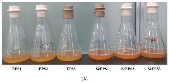As shown in Figure 1A, after cultivating with the presence of 20 mg/L sodium selenite, the color of the B. subtilis SR41 broth changed to a light orange color. After the addition of ethanol, both EPS and SeEPS cultures exhibited flocculent precipitation, which represented exopolymers (Figure 1B,C). The dry matter contents of SeEPS and EPS were 37.8 ± 0.3 g/L and 40.3 ± 0.2 g/L, respectively. There was no significant difference between SeEPS and EPS in terms of the protein and sugar content. The total selenium content of SeEPS was 554.7 ± 9.5 mg/kg (Table 1).