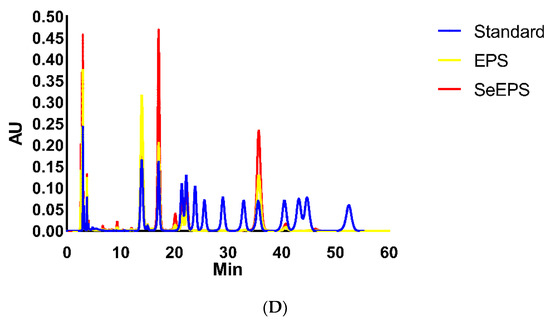 Monosaccharide composition analysis by HPLC. (A) peak spectrum for standards, (B) peak spectrum for EPS, (C) peak spectrum for SeEPS and (D) comparison among EPS, SeEPS and standards.