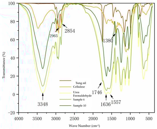 Figure 2 shows the infrared spectrum analysis of the core material, wall material, and two kinds of microcapsules. It can be seen that 3348 cm−1 is the stretching vibration peak superimposed by N-H and O-H, 1636 cm−1 and 1557 cm−1 are the stretching vibration peaks of C=O and C-N, respectively. The absorption double peaks near 2965 cm−1 come from the stretching vibration of methylene in the molecular structure of cellulose, and the characteristic absorption peak at 1380 cm−1 is the stretching vibration of methyl groups, which are the characteristic peaks of wall urea-formaldehyde and cellulose [,]. This shows that the wall material of microcapsules exists. The stretching vibration peak of unsaturated bond C-H is 2854 cm−1, and 1746 cm−1 is the stretching vibration peak of C=O. These are the characteristic peaks of core tung oil, indicating that core tung oil also exists. The core and wall materials of the microcapsules can be found in the whole spectrum, which can prove that microcapsules contain core and wall materials. From the infrared spectra of the two microcapsules, it can be seen that the microcapsules of sample 10 do not have methylene double peaks from the molecular structure of cellulose near 2965 cm−1, indicating that there is no cellulose in the microcapsules, while other characteristic peaks are consistent with those of sample 6. Therefore, the microcapsules without cellulose were also successfully prepared.