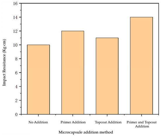 The impact resistance of water-based paint film using different addition methods is shown in Figure 3. The impact resistance of the paint film prepared without microcapsules was 10.0 kg·cm, while the impact resistance of the paint film with microcapsules has been improved to a certain extent. The impact resistance of the paint film with the microcapsules added in the topcoat and the primer was 11.0 kg·cm and 12.0 kg·cm, respectively, while the impact resistance of the paint film with the microcapsules added in the primer and the topcoat at the same time was 14.0 kg·cm. The impact resistance of the paint film with microcapsules added in the primer and topcoat was not as strong as that of the paint film with the microcapsules added in the primer and topcoat at the same time, because although the microcapsules were able to improve the impact resistance of the paint film to a certain extent, the force between the paint film and the wood surface became diminished due to the agglomeration of microcapsules, so the paint film could not be well-attached to the wood surface. As a result, the impact resistance of the paint film was not so strong. It can be seen that the impact resistance of the paint film with the microcapsules added in the primer and topcoat at the same time was the best.