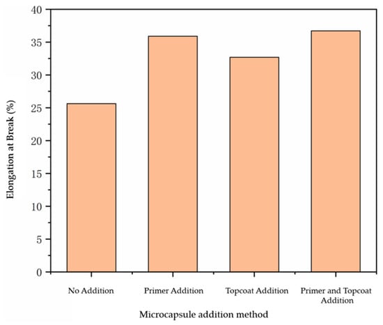 The results for the elongation at break of the paint film prepared using the different addition methods are shown in Figure 4. From the figure, it can be seen that adding microcapsules can enhance the elongation at break of the paint film. The elongation at break of the paint film without microcapsules was only 25.62%. When the microcapsules with a content of 10.0% were added, the elongation at break of the paint film was able to be increased to 32.68–36.72%. Due to the different adding methods for the microcapsules, there were certain differences in the elongation at break of the paint film, but the differences were negligible. It can be concluded that the addition of microcapsules can improve the elongation at break of the paint film to a certain extent and improve the toughness of the paint film.