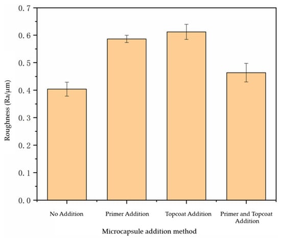 By testing the roughness of the paint film prepared using the different adding methods, we can analyze whether the surface of the paint film was flat after adding microcapsules. In Figure 5, Ra represents the arithmetic average roughness, which was used to evaluate the overall roughness of the surface. It can be seen from the analysis that the roughness of the paint film without microcapsules was 0.42 μm. The roughness of the paint film with the microcapsules added in the primer and topcoat at the same time increased to 0.45 μm. The roughness of the paint film with the microcapsules added in the primer and topcoat increased to 0.59 μm and 0.61 μm, respectively. The surface of the paint film with the microcapsules added in the primer and topcoat at the same time became more uneven. This is because the microcapsules were too concentrated in the primer or topcoat, resulting in the agglomeration of microcapsules, which made the surface of the paint film rough. To sum up, the roughness of the paint film with microcapsules increased, and the paint film with the microcapsules added in the primer and topcoat at the same time had a smoother surface and less roughness than did the paint film with microcapsules added in the primer or topcoat only.