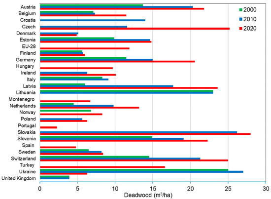 Average volumes of deadwood in European countries, 2000–2020 [2,3].