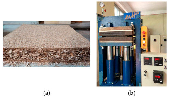 Three-layered particleboards of 290 × 290 mm dimensions and a thickness of 16 mm with a target density of 650 kg/m3 were made. The boards contained particles from deadwood and sound wood. Particles from deadwood were added to the outer and core layers of the boards in the amount of 25%, 50%, 75% and 100%. The mass share of the outer layers was 33%, and the core layer was 67%. The amounts of UF resin, urea, hardener, and paraffin emulsion that were required for the mixing process were different for the core layer and the outer layers. This is due to the temperature difference between the surface and the core caused by heat transfer from the surface to the core of the board. In addition, the different amount of resin and additives used is related to the difference in the surface area of the particles used in the core and outer layers of the board. The amount of solid UF resin was 14 wt.% and 9 wt.% based on the weight of oven-dried wood particles for the outer and middle layers, respectively. During resin mixing, 2.3% and 0.5% of urea solution and 0.2% and 0.6% of ammonium sulfate were added, based on the weight of dry particles, to UF resin for the outer and core layers, respectively. A 0.8% of paraffin emulsion based on the weight of dry particles was also included in the resin mixture. The MUF resin was added to the UF adhesive used for the core layer. Wood particles were mixed with adhesive by hand. After mixing, the resinated particles were evenly distributed by hand in a 290 mm × 290 mm rectangular wooden mold. Pre-pressing of the formed mat was carried out manually in the wooden box. Next, the mat (Figure 3a) was subjected to hot pressing in an automatically controlled hydraulic laboratory press “xoMкo” (LLC “ODEK” Ukraine, Ukraine) (Figure 3b) at the pressure of 2.5 MPa, temperature of 190 °C and the pressing time of 22.5 s/mm. During the last 30 s of the pressing cycle, the pressure was continuously reduced to 0 MPa. The experimental design for this study is summarized in Table 2.