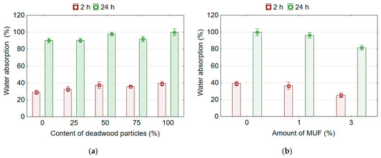 Water absorption of boards samples depending on content of deadwood particles (a) and amount of MUF resin in adhesive (b).