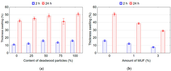 Thickness swelling of boards samples depending on content of deadwood particles (a) and amount of MUF resin in adhesive (b).