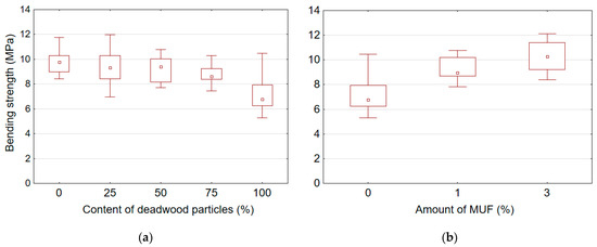 Bending strength of boards samples depending on content of deadwood particles (a) and amount of MUF resin in adhesive (b).