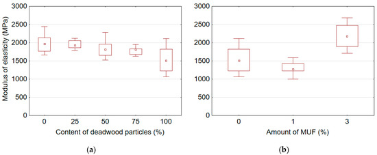 Modulus of elasticity of boards samples depending on content of deadwood particles (a) and amount of MUF resin in adhesive (b).