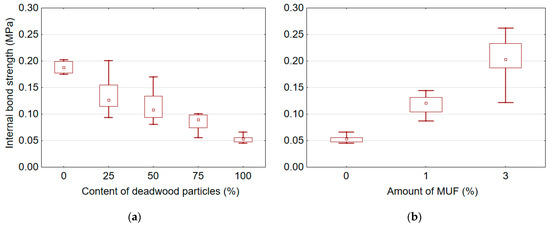 Internal bond strength of board samples depending on the content of deadwood particles (a) and amount of MUF resin in adhesive (b).