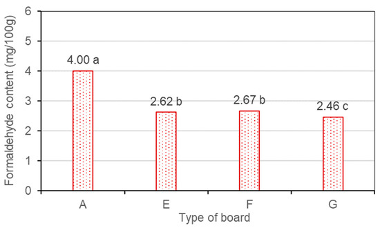 Markedly, the boards (type E) made from deadwood particles like as the control board, reached the E1 emission class (≤8.0 mg/100 g) but characterized by a much lower FC than the reference boards (type A) made from conventional sound wood particles. In the boards made from deadwood particles (type E), the formaldehyde content is lower by 34.5% compared to the reference samples (type A) made from conventional sound wood particles (Figure 9).