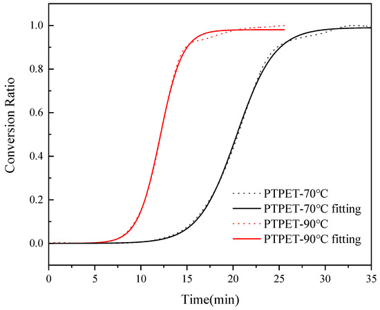 The conversion ratio of ATPET and GAP reactions versus time and the fitting curve.