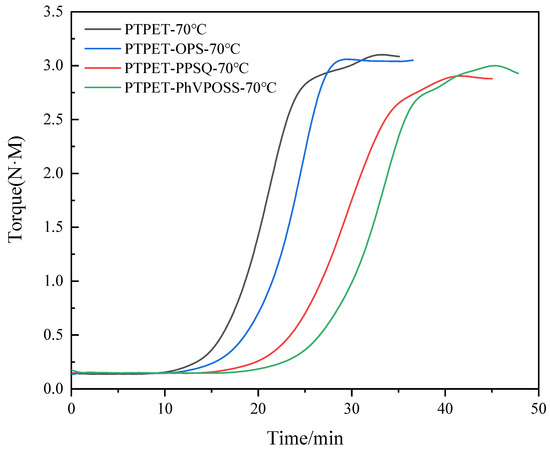 In order to study the influence of different additives on the click chemistry reaction between azide and alkyne, torque versus time curves for PTPET, PTPET-PPSQ, PTPET-OPS and PTPET-PhVPOSS prepared at 70 °C are shown in Figure 5. Figure 6 shows the conversion rate–time curve of PTPET elastomer and three composites. Compared to the process of preparing PTPET elastomer, all three click chemistry reactions with additives generally exhibited similar S-shaped curves during the entire reaction process. The click chemistry reactions could be clearly seen to have three stages: In the initial stable stage, the raw materials ATPET, GAP, catalyst C2610 and flame retardant are heated and sheared for a better mixing condition. Differences in the rate of temperature increase could be clearly observed after the additives were added. The system with OPS has the highest rate of temperature increase. The middle reaction accelerating stage where the torque increases significantly indicates the most rapid click chemistry reaction between ATPET and GAP. It could be observed that the click chemistry reaction is barely affected by the additives since all three systems could still react rapidly. The final stable stage where the torque values remain at a high level indicates that the reaction approaches the end. The torque as the parameter of the reaction extent could be used to compare the reaction with different additives. For PTPET-OPS, the accelerating period is dramatically steep, and the reaction is completed in 27 min and remains stable as the click chemistry approaches the end. The polymerization of PTPET-PPSQ and PTPET-PhVPOSS composites was delayed compared to that of the PTPET-OPS. At the end of the polymerization, PTPET-PPSQ and PTPET-PhVPOSS composites seem to degrade according to the reduction in torque.