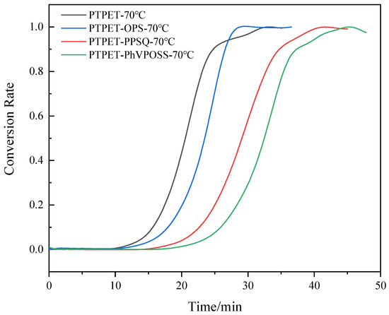 Conversion rate versus time curves of PTPET elastomer and composites at 70 °C.