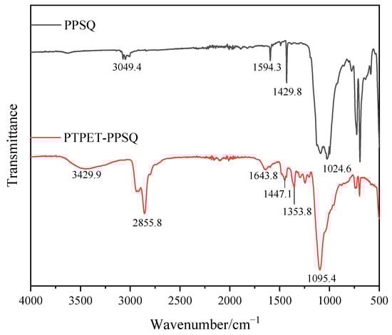 The FT-IR spectrum of the prepared PTPET-PPSQ is shown in Figure 7. It can be seen from the FT-IR of PPSQ in Figure 7 that there is an unobvious absorption band of the Si-OH group that is located within 3200~3700 cm−1. The absorption peak at 3049.4 cm−1 is the stretching vibration peak of C-H in the phenyl group from the PPSQ particles. The absorption peaks at 1594.3 cm−1 and 1429.8 cm−1 are carbon skeleton vibrations in the phenyl group. The two absorption peaks at 693.5 cm−1 and 726.0 cm−1 in the fingerprint region are C-H out-of-plane bending vibration regions. The absorption peak at 1095.4 cm−1 is the stretching vibration peak of Si-O-Si in PPSQ.
