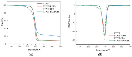 The thermal properties of the PTPET elastomer and composites (PTPET-PPSQ, PTPET-OPS and PTPET-PhVPOSS) are key parameters in judging whether the materials are suitable for engineering applications. TG and DTG data of the PTPET elastomer and composites are drawn in Figure 10. Detailed data are listed in Table 2. It could be observed that under the nitrogen atmosphere, the PTPET-OPS composite has the highest thermal stability. The decomposition temperature of the initial 5% (T5%) total mass is 351 °C. The maximum thermal mass loss rate is at 396 °C, and it has the most residual mass, reaching 19.33% [26]. For PTPET-PPSQ and PTPET-PhVPOSS, both have less residual mass percentage than half of that of PTPET-OPS. The T5% decomposition temperature of PTPET elastomer is only 292 °C. The thermal stabilities of the PTPET composites prepared by adding PPSQ, OPS and PhVPOSS have been significantly improved. The maximum thermal decomposition rate temperature of the three PTPET composites is close to 400 °C.