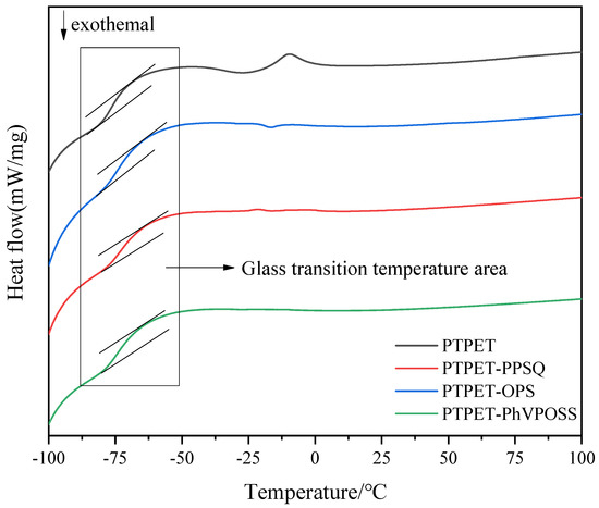 The heat flux curves from DSC measurements of the PTPET elastomer and composites are shown in Figure 11. Detailed DSC data are listed in Table 3. The box area in Figure 11 is the glass transition region of PTPET elastomer and composites. The glass transition temperature has been identified as the inflection point between two parallel tangents drawn on the curves. It can be seen that there is no significant difference in the glass transition temperature (Tg) between the PTPET elastomer and composites. The Tg of the PTPET elastomer is −76 °C, and the Tg values of all PTPET composites are slightly higher than the Tg of the PTPET elastomer. Among all three PTPET composites, PTPET-PPSQ has a higher Tg, namely −72 °C. The Tg of PTPET-PhVPOSS is lower, namely −75 °C. When comparing all the Tg values shown in Table 3, it can be seen that the Tg values of the PTPET composites do not change greatly with the addition of OPS, PPSQ and PhVPOSS.