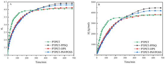 It could also be observed from the torque–time curve in Figure 3 that in the late period of the polymerization reaction, the torque of the reaction system has a small upward step. This phenomenon may be related to the transformation of PTPET from a linear structure to a cross-linking structure, which needs further study.