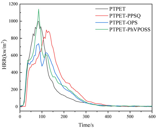 The heat release (HRR) rate curves of the PTPET elastomer and composites are shown in Figure 15. It can be seen from Figure 15 that PTPET-PhVPOSS has a higher peak heat release rate (p-HRR) of 1140 kW/m2 soon after ignition, which is even greater than the 998 kW/m2 of the PTPET elastomer. The p-HRR of PTPET-PPSQ and PTPET-OPS composites exhibit only 897 kW/m2 and 737 kW/m2, respectively. For PTPET-OPS, two peaks appeared in the heat release (HRR) curve. It is believed that PTPET-OPS forms a carbon layer after the rapid combustion in the initial stage, which can reduce the heat release rate to a certain extent, but then the fragile and insufficiently compact carbon layer is subjected to continuous high temperature and oxidation during the combustion process and completely destroyed, so the heat release rate reaches a second peak. When comparing the cone test results of the three PTPET composites PTPET-PPSQ, PTPET-OPS and PTPET-PhVPOSS with the PTPET elastomer, it can be concluded that the addition of PPSQ and OPS can improve the flame retardancy of PTPET.