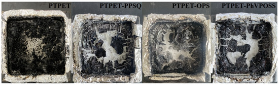 Figure 16 shows the residues of the PTPET elastomer and composites after the cone test. It seems that the pure PTPET elastomer has more char. The triazole structure in the PTPET network may be helpful to form some aromatic carbon during pyrolysis under high temperature. All the PTPET composites with the PPSQ, OPS and PhVPOSS form the cracked char layer after combustion. It is believed that all PTPET composites PTPET-PPSQ, PTPET-OPS and PTPET-PhVPOSS show certain flame retardancy, and PTPET-PPSQ and PTPET-OPS are better.