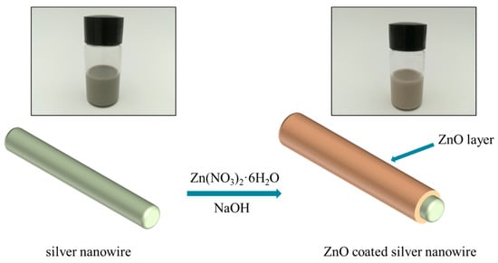 24]. Among these methods, the precipitation technique is most widely used due to its simple operation and mild reaction conditions. The basic principle is to add the precipitant dropwise to the salt solution containing zinc to slowly precipitate crystal nuclei at an appropriate temperature. Further growth of nuclei results in nano-scale ZnO crystal grains. Therefore, in this paper, the precipitation method was used to synthesize nano-ZnO over the surface of the prepared AgNWs. The schematic diagram of the preparation process of AgNW@ZnO is shown in