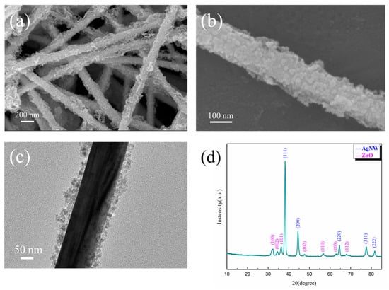 Figure 4d. The diffraction peaks of (111), (200), (220), (311), and (222) crystal planes corresponding to the AgNWs are seen. In addition, typical characteristic diffraction peaks of ZnO appeared at 31.9°, 34.5°, 36.3°, 47.7°, 56.7°, 62.9°, and 68.1° in the XRD pattern, which can be indexed respectively to the (100), (002), (101), (102), (110), (103), and (112) crystal planes of the hexagonal wurtzite structure of ZnO. Except for AgNWs and ZnO phase diffraction peaks, no other peaks are noticed, which indicates the high purity of the obtained AgNW@ZnO filler.