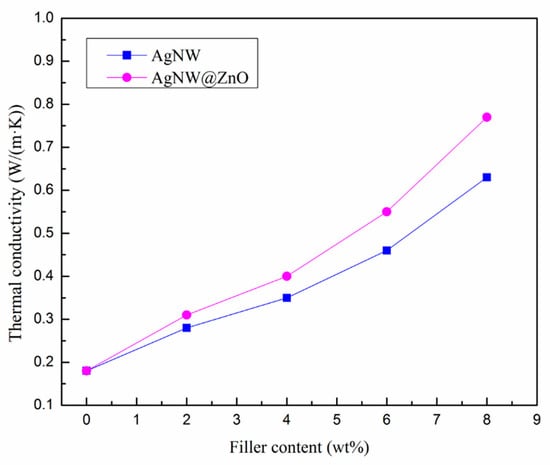 The thermal conductivity of the AgNW/EP composites is significantly improved and increased with the increase of AgNWs content. For instance, the thermal conductivity of pure epoxy resin is only 0.18 W/(m·K), whereas, for 8 wt% AgNWs fillers content, AgNW/EP composites’ thermal conductivity is increased to 0.63 W/(m·K). A similar increasing trend of thermal conductivity is observed for AgNW@ZnO filler. In contrast, for the same mass fractions of two fillers, the thermal conductivity of AgNW@ZnO/EP composite is found to be higher than that of AgNW/EP composite. At 8 wt% AgNW@ZnO filler content, the thermal conductivity of AgNW@ZnO/EP composites is 0.77 W/(m·K), which is 22% higher than the AgNW/EP composites.