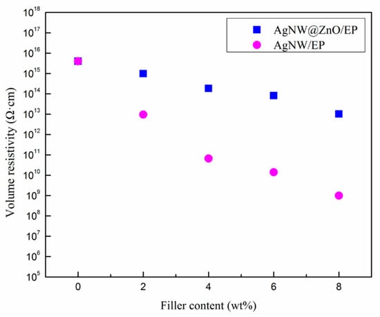 Figure 8. The volume resistivity of the AgNW/EP is decreased sharply with the increase of AgNWs filler content. For 8 wt% AgNWs, the volume resistivity dropped by seven orders of magnitude. However, the volume resistivity of AgNW@ZnO/EP composites decreased gradually with the increase of filler content. For 8 wt% AgNW@ZnO filler fraction, the volume resistivity of the AgNW@ZnO/EP composites remains as high as 10